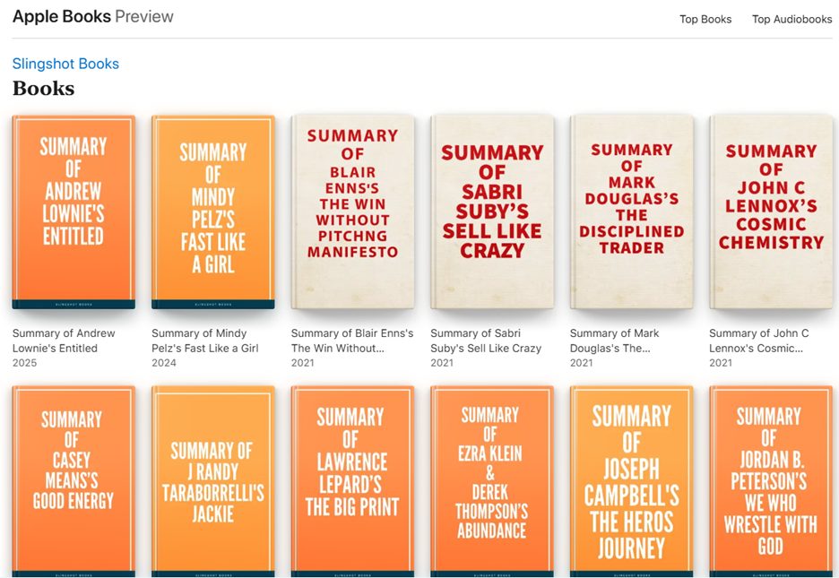 Unfortunately, there are plenty of so-called publishers producing book summaries illegally. Earlier this week, a member of our community discovered that a summary of his book is being sold through Apple Books by a publisher named Slingshot Books.